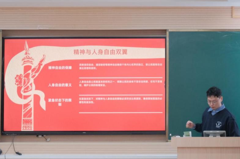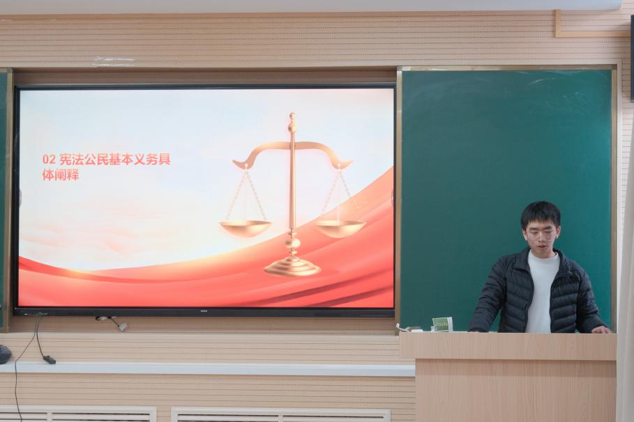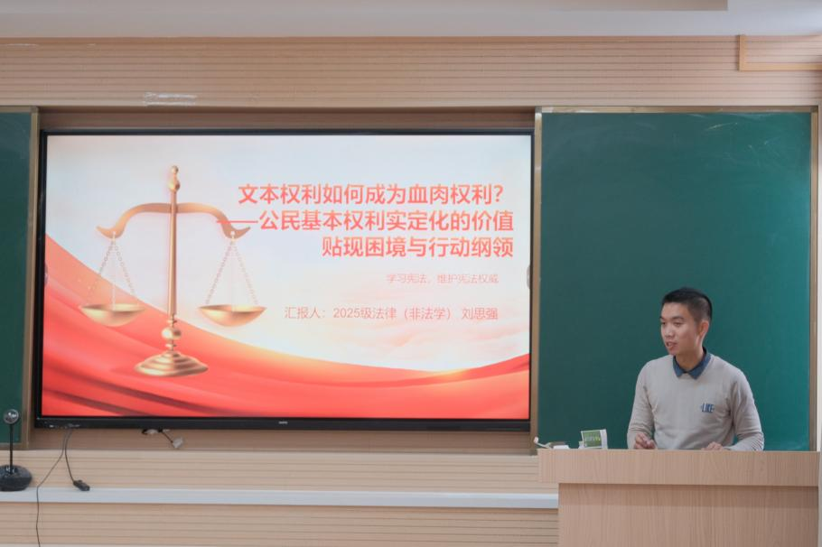 课堂围绕“公民的基本权利与义务”主题展开,由三位研究生担任主讲人。王兴同学系统阐释了公民基本权利的内涵与宪法依据。