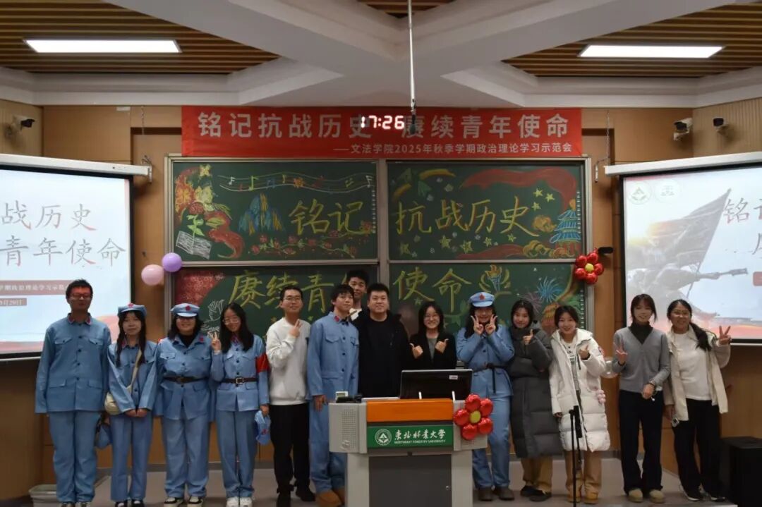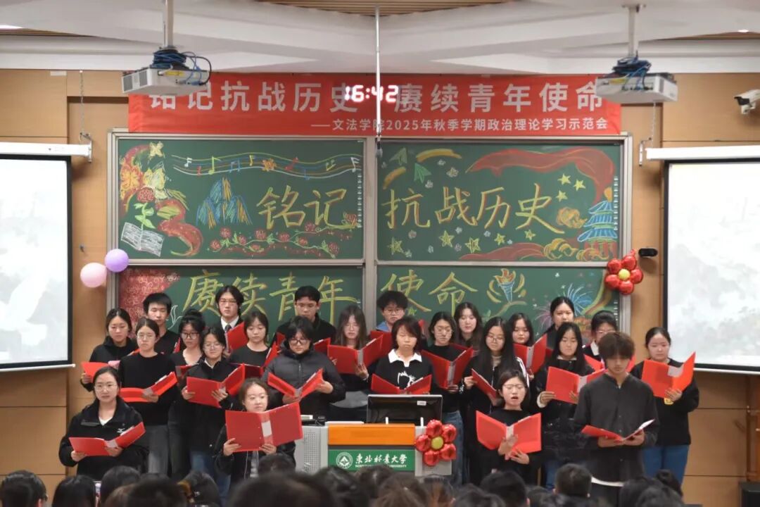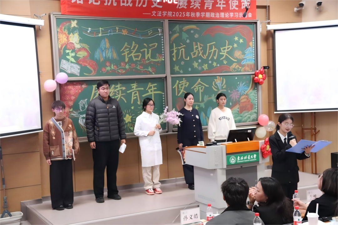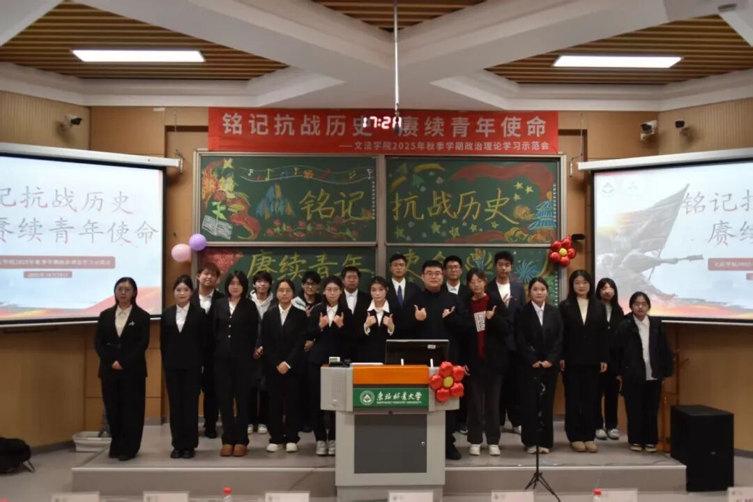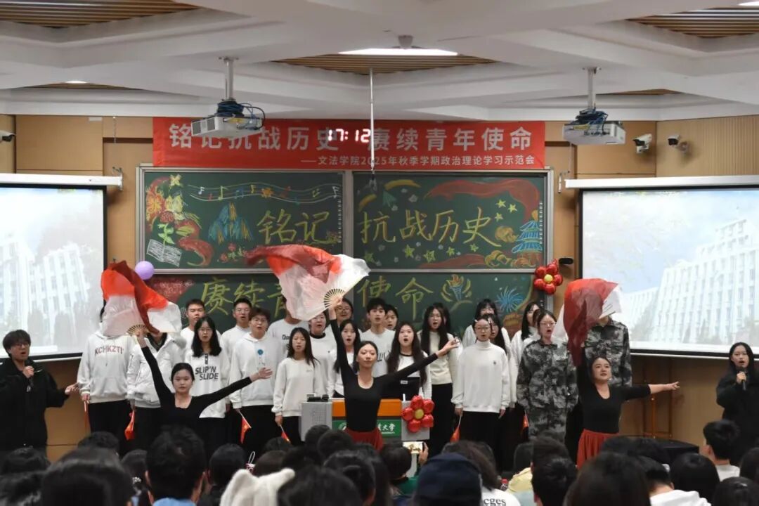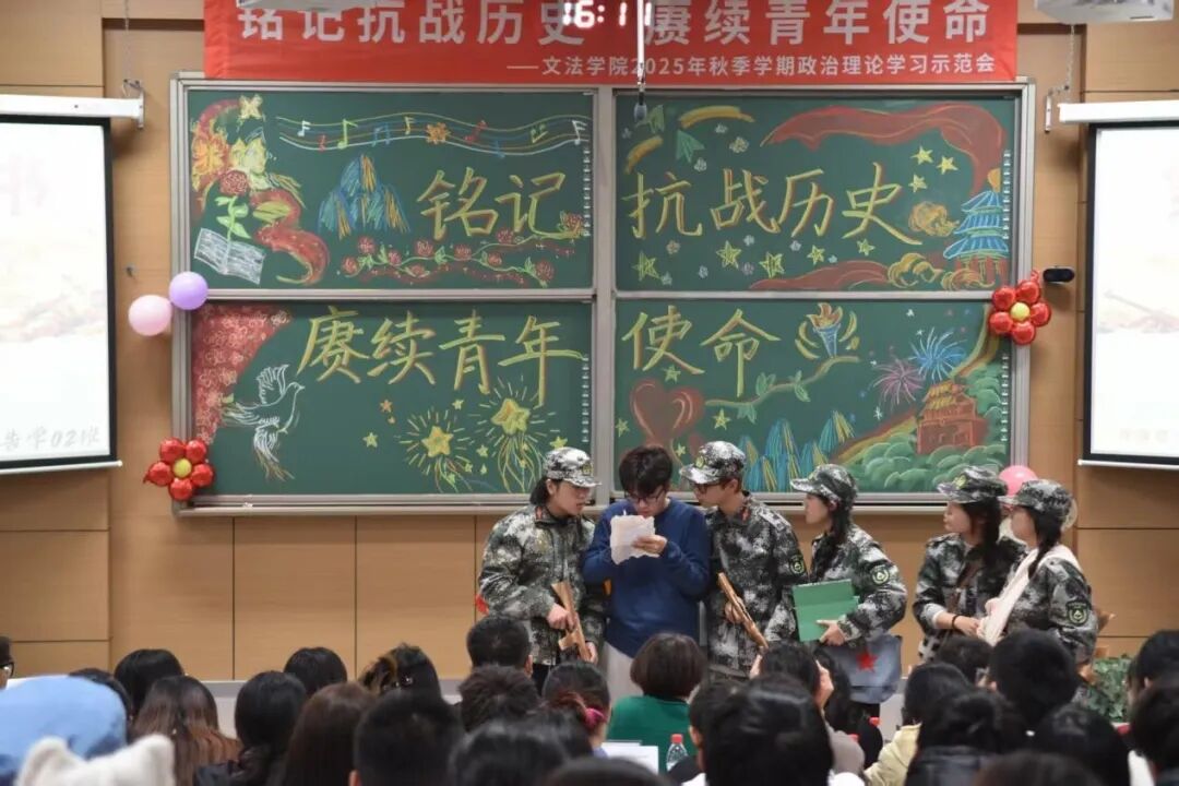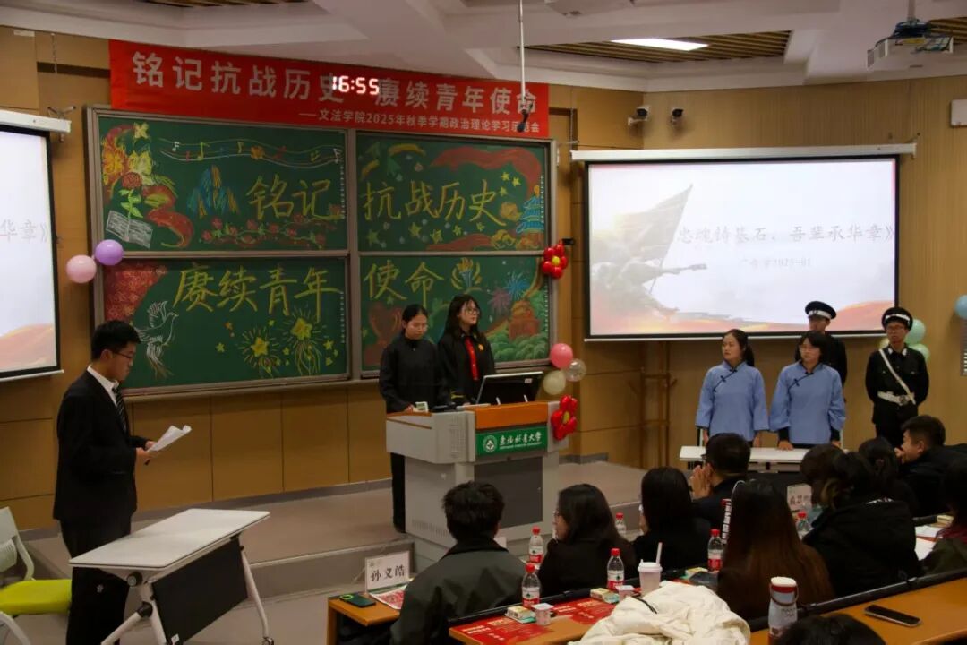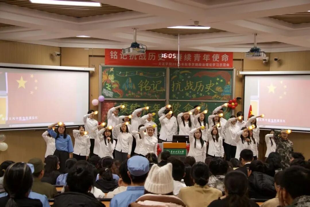 为深入贯彻落实党的二十大和二十届四中全会精神,进一步激发青年学生的爱国主义情怀,鼓励新时代青年挺膺担当,躬身入局,冰球突破mg正规官网团委联合大学生理论指导中心于10月29日下午在锦绣楼T301开展了以“铭记抗战历史,赓续青年使命”为主题的政治理论学习示范会。