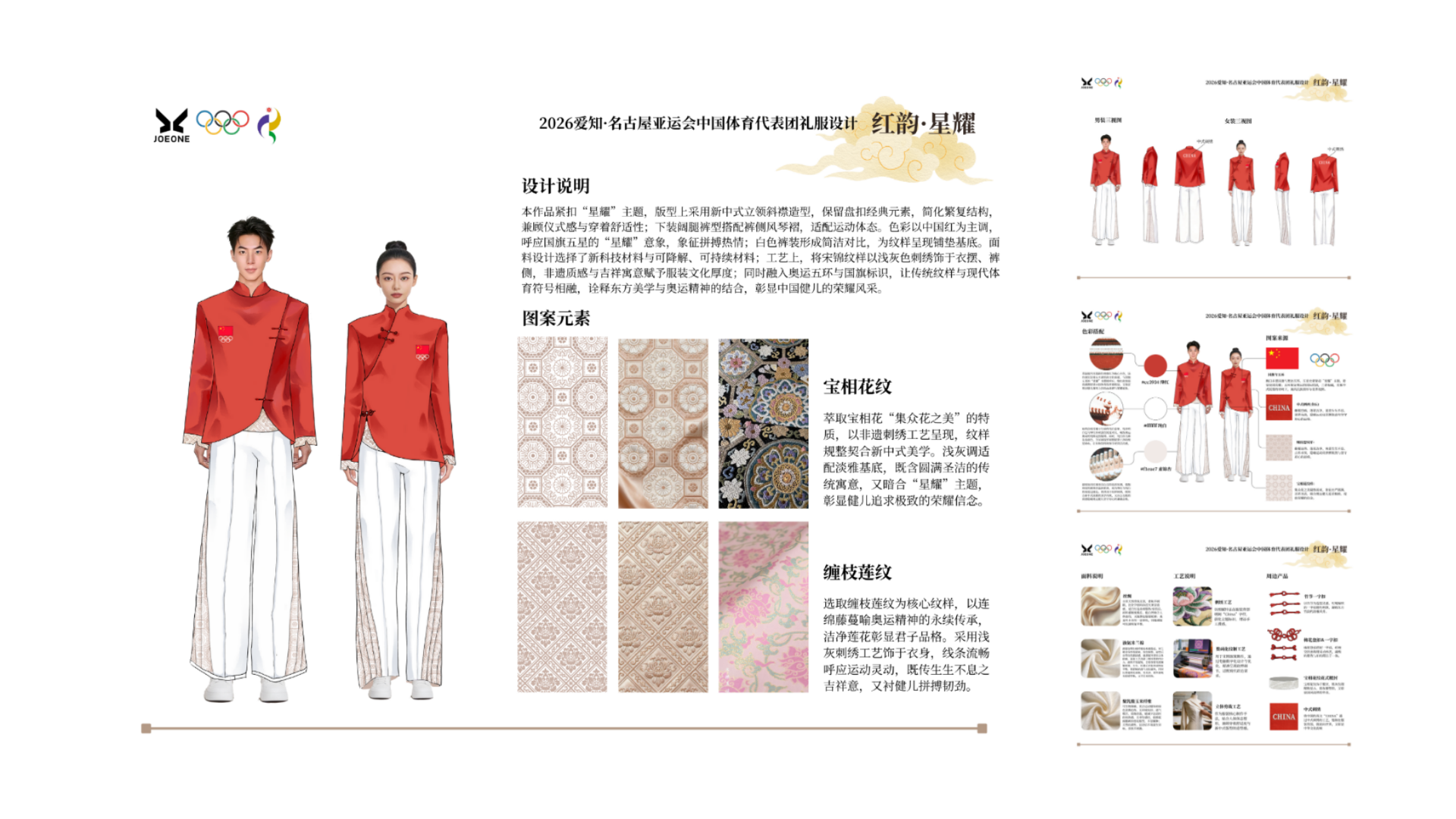 3、入围作品《红韵·星耀》,作品融合“星耀”主题,简化繁复结构,兼顾仪式感与穿着舒适性。版型融合了汉代元素,图案设计融合宋锦元素,面料设计选择了科技材料与可持续材料,工艺上,刺绣工艺融合数字化技术。同时融入奥运五环与国旗标识,让传统文化与现代体育元素相得益彰,诠释中国传统美学与奥运文化的融合,彰显亚运会运动员的荣耀气韵。
