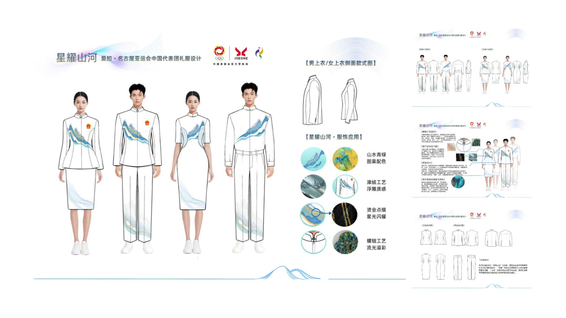 1、入围作品《星耀山河》,作品融合宋代绘画《千里江山图》的视觉文化元素,展现宋代美学特征。“星耀”对应运动员如亚运赛场的星光闪耀,“山河”承载中国山水美学的文化底蕴,通过礼服将体育竞技的活力与家国文化的厚重具象化呈现。从款式结构、色彩体系和图案元素都进行了精心打磨,通过中式元素与现代设计的融合,彰显文化自信。